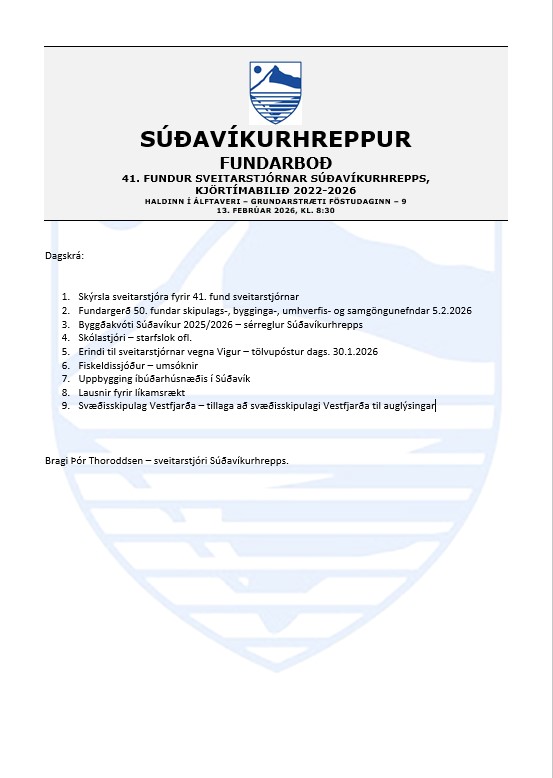 41. fundur sveitarstjórnar Súðavíkurhrepps kjörtímabilið 2022-2026 verður haldinn í Álftaveri. Dagskrá sbr. meðfylgjandi fundarboð.