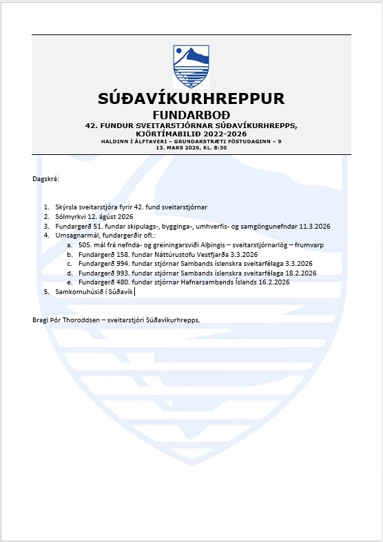 Föstudaginn 13. mars 2026 verður haldinn 42. fundur sveitarstjórnar Súðavíkurhrepps kjörtímabilið 2022-2026 og hefst fundurinn kl. 8:30 í Álftaveri - Grundarstræti 1.