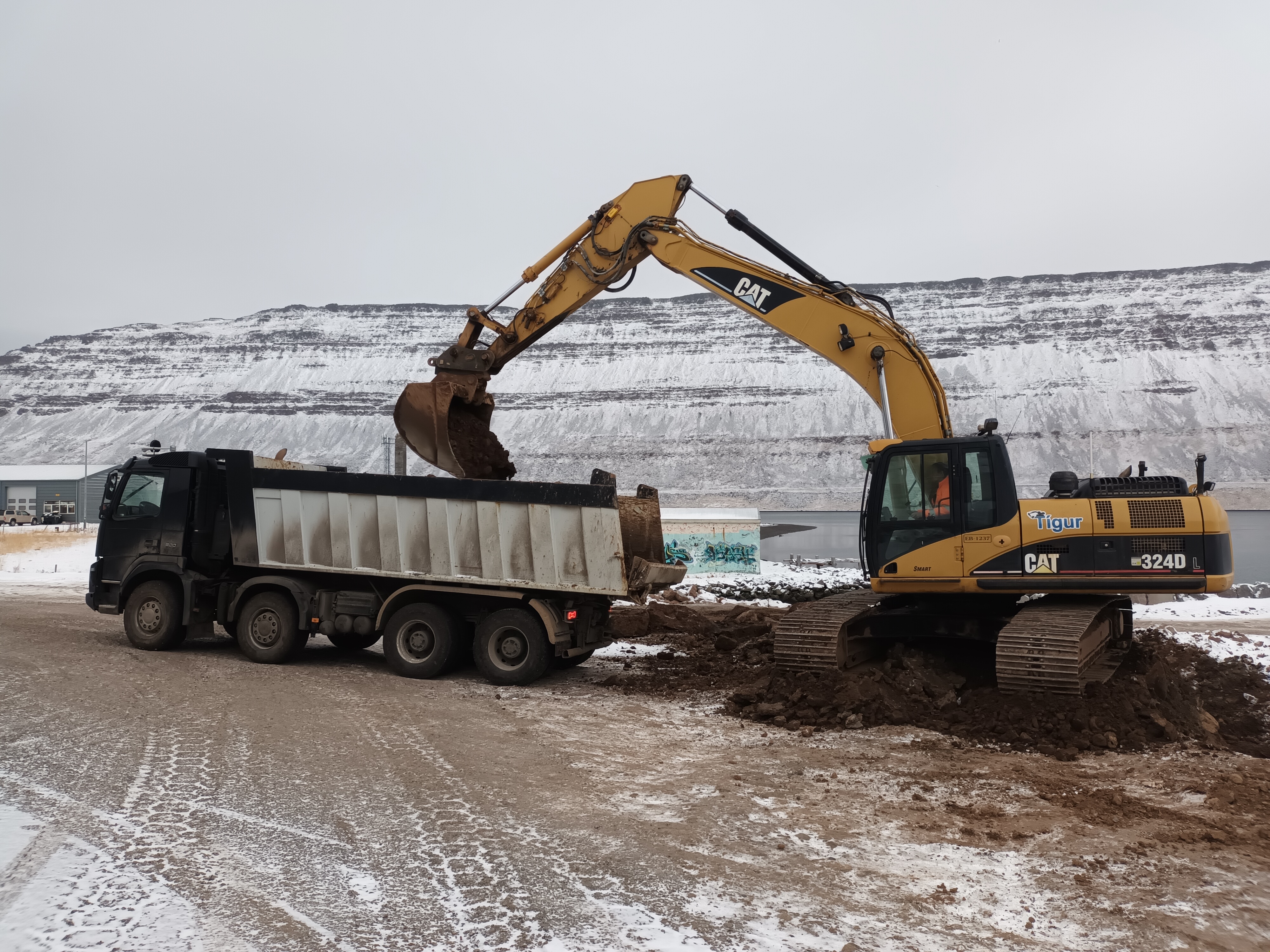 Langeyri: Síðastliðinn miðvikudag, þann 5. nóvember hófst Tígur efh. handa við að koma landfylligu í þá hæð sem skila á undir lóð og flytja að efni til þess að klára það sem útaf stendur. Innkoman á landfyllinguna að norðanverðu verður breiðari sem nemur því að garðurinn verður settur í beinni línu og kemur í hornið á gmlu bryggjunni við rækjuverk-smiðjuna til samræmis við deiliskipulag fyrir Langeyri. Einnig verður unnið samhliða, eftir veðurfari, að því að stækka fyllinguna um 40 m til norðurs. Mikið hefur unnist á stuttum tíma og áætlun að ganga eftir.