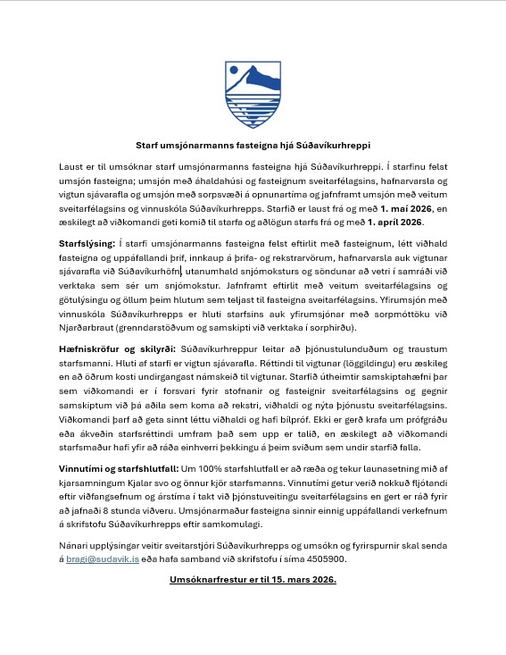 Starf umsjónarmanns fasteigna hjá Súðavíkurhreppi er auglýst hér sbr. meðfylgjandi.