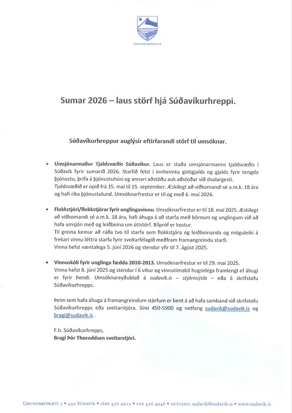 Súðavíkurhreppur auglýsir eftirfarandi störf fyrir sumarið 2026, sbr. meðfylgjandi auglýsingu.